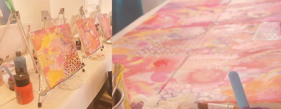 Wir legen alle Leinwände zusammen auf den Tisch, sodass eine große Fläche entsteht. Dann gilt: Jeder malt auf jeder Leinwand – jede Idee darf weitergeführt, ergänzt oder verwandelt werden. Nach der Pause wird daraus etwas ganz Besonderes: Jede/r nimmt seine Leinwand und macht daraus sein eigenes fertiges Bild.